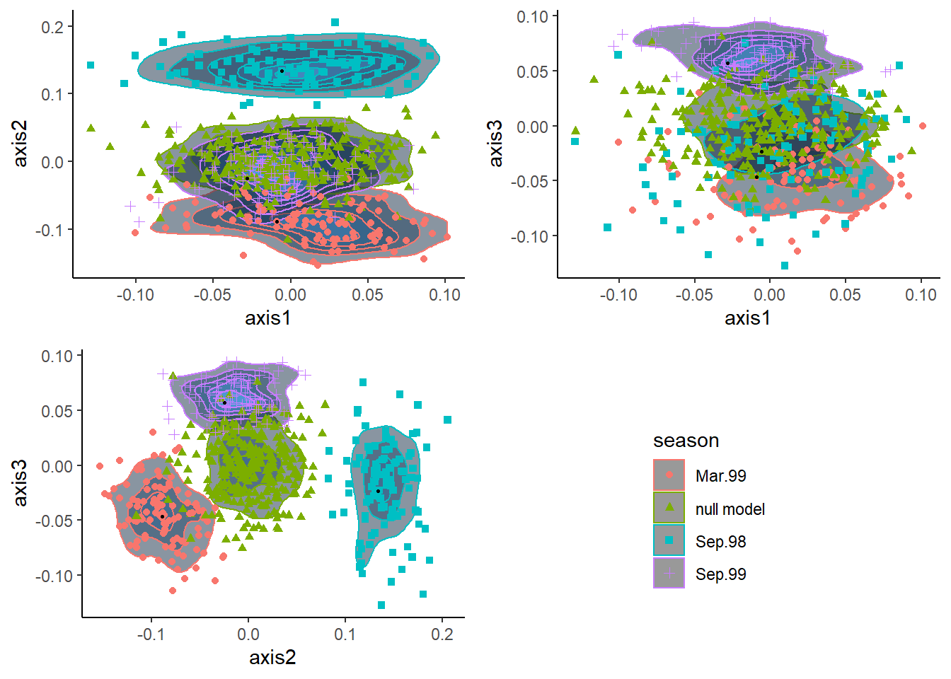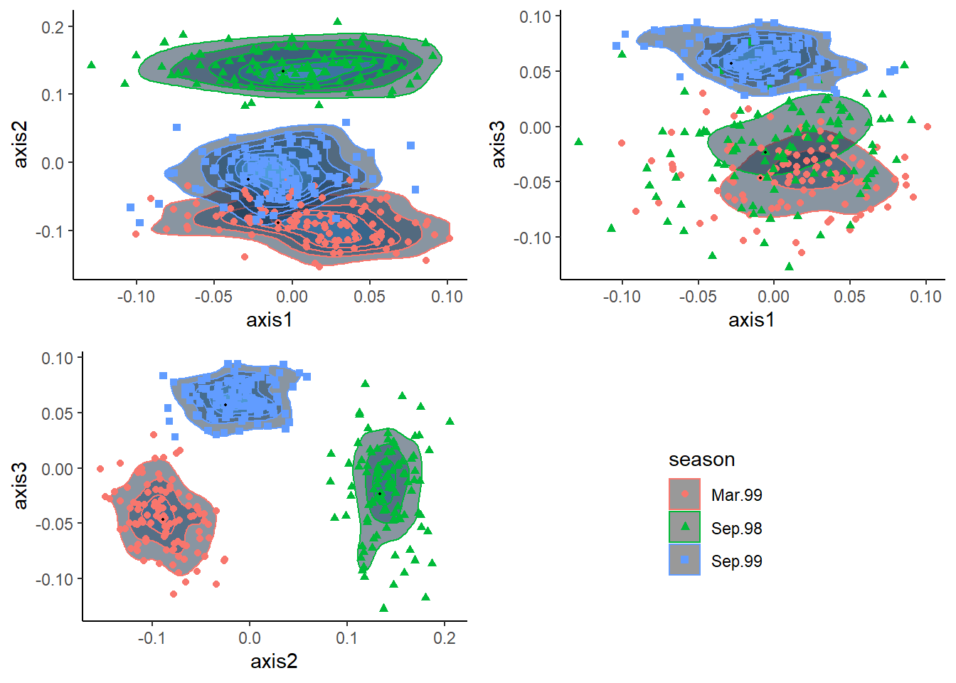 p23 = ggplot(data = plot_data, aes(x = axis2, y = axis3, col = season)) +