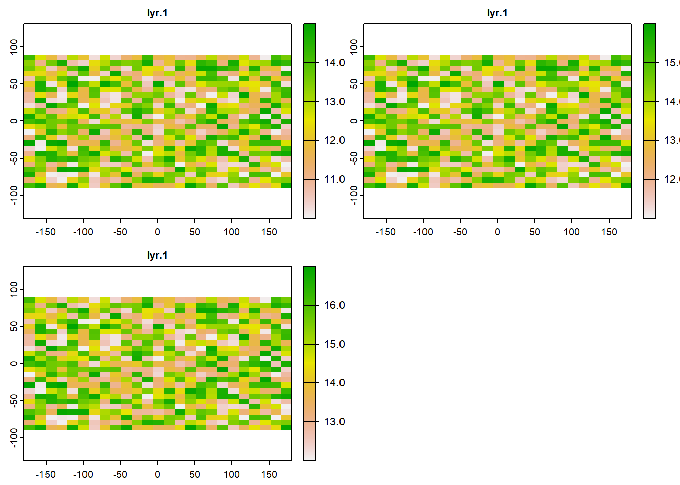 # Now we create two rasters that are based on r1 but slightly warmer.