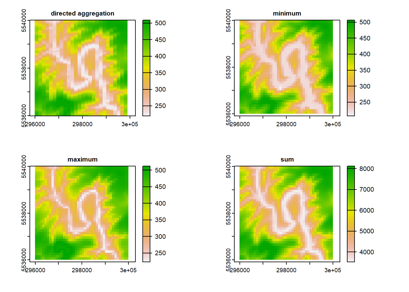 dem1_agg_sum = aggregate(dem1, fact = 4, fun = "sum")