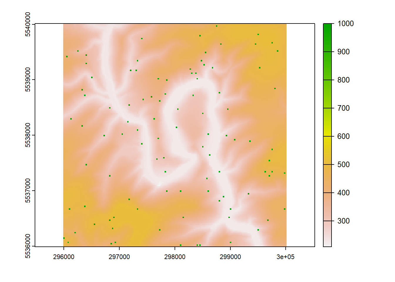 To demonstrate this, we will need some vector data sets. For the point data, we can simulate points within the bounding box of the DEMs we used before.